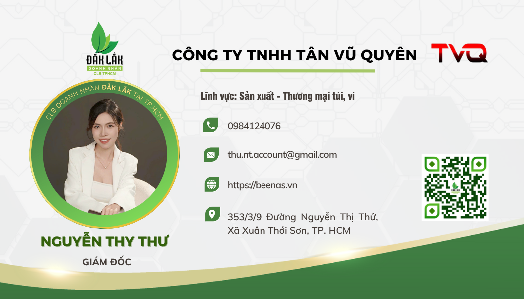 Chúng tôi tin rằng, sự hợp tác giữa Công ty TNHH Tân Vũ Quyên và Quý đối tác sẽ mở ra những cơ hội kinh doanh hiệu quả, bền vững, cùng phát triển thương hiệu và gia tăng lợi ích kinh tế cho đôi bên.