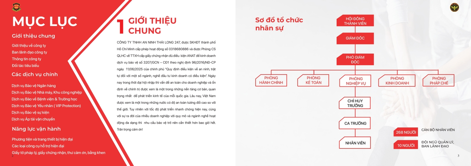 Công ty TNHH AN NINH THÁI LONG 247, được Sở Kế hoạch & Đầu tư TP. Hồ Chí Minh cấp phép hoạt động với mã số thuế 0318680886, hoạt động trong lĩnh vực cung cấp dịch vụ bảo vệ chuyên nghiệp theo quy định tại Nghị định 96/2016/NĐ-CP ngày 01/07/2016 của Chính phủ về “Quy định điều kiện về an ninh, trật tự đối với một số ngành, nghề đầu tư kinh doanh có điều kiện”. Trong bối cảnh xã hội phát triển không ngừng, vấn đề an toàn – an ninh ngày càng trở nên cấp thiết và đóng vai trò nền tảng cho sự ổn định của doanh nghiệp, tổ chức và toàn xã hội. Chính vì vậy, nhu cầu sử dụng các dịch vụ bảo vệ chất lượng cao ngày càng tăng, đặc biệt trong những lĩnh vực yêu cầu bảo mật, an toàn tuyệt đối.