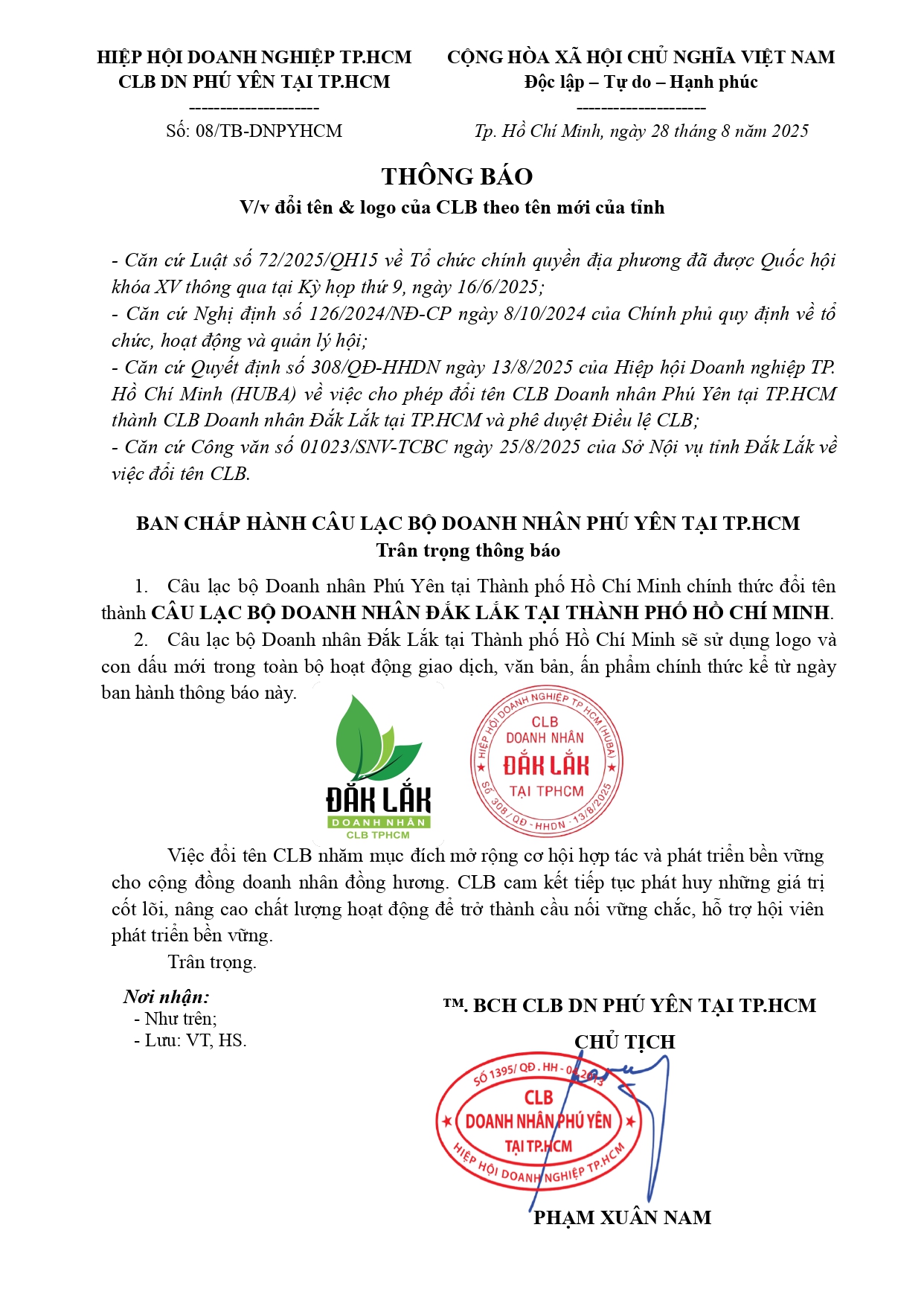 Sau 17 năm hoạt động và tạo dựng nhiều dấu ấn, Câu lạc bộ Doanh nhân Phú Yên tại TP.HCM (CLB DN PY) đã chính thức công bố một quyết định lịch sử: đổi tên thành CLB Doanh nhân Đắk Lắk tại TP.HCM (CLB DN ĐL). Thông tin được công bố trong một văn bản chính thức, đánh dấu bước ngoặt quan trọng trên hành trình phát triển của cộng đồng doanh nhân đồng hương này.