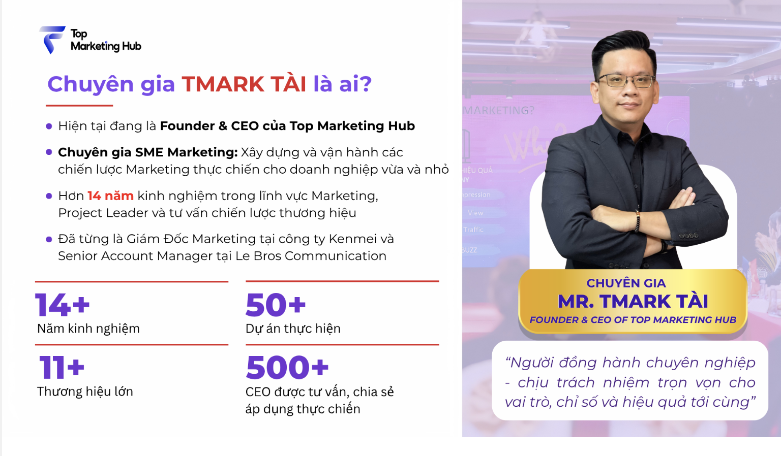 Sự kiện có sự góp mặt đặc biệt của diễn giả Mr. Tmark Tài – CEO Top Marketing Hub. Với kinh nghiệm thực chiến trong việc triển khai các hệ thống marketing tự động, ông sẽ chia sẻ những bí quyết và Case Study thực tế giúp doanh nghiệp áp dụng ngay vào mô hình kinh doanh của mình.