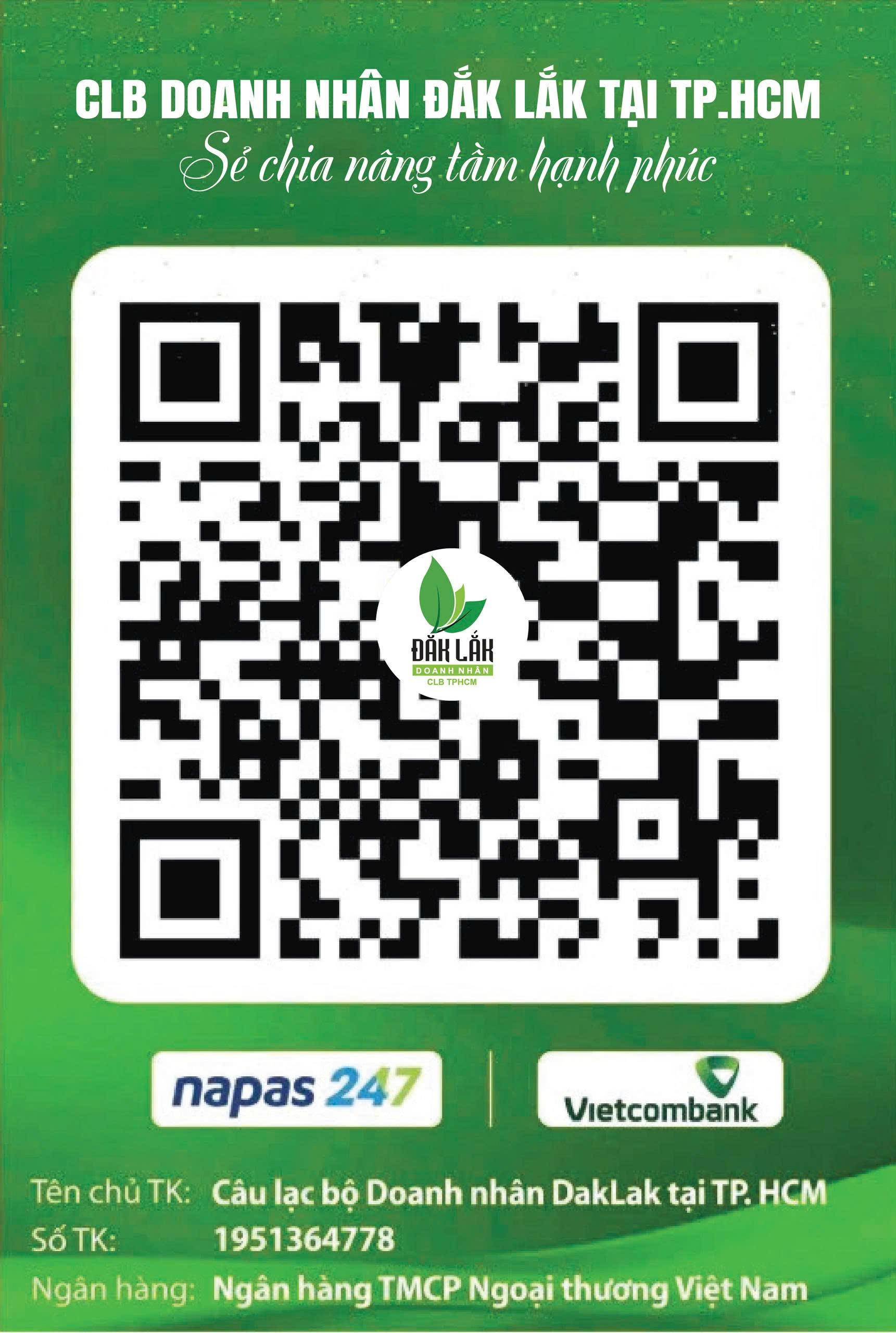 - Số tài khoản: 1951364778 - CLB DOANH NHAN DAK LAK TAI TP.HCM - Vietcombank - PGD Phổ Quang - CN Tân Sơn Nhất