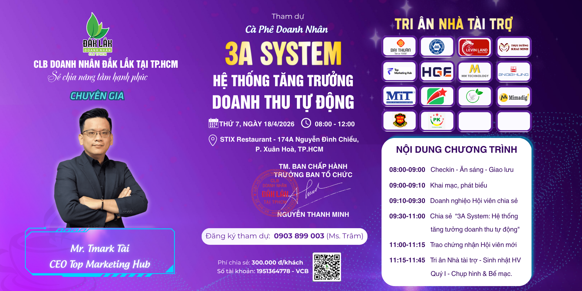 - 09:30 - 11:00: Chia sẻ chủ đề: "3A System: Hệ thống tăng trưởng doanh thu tự động".